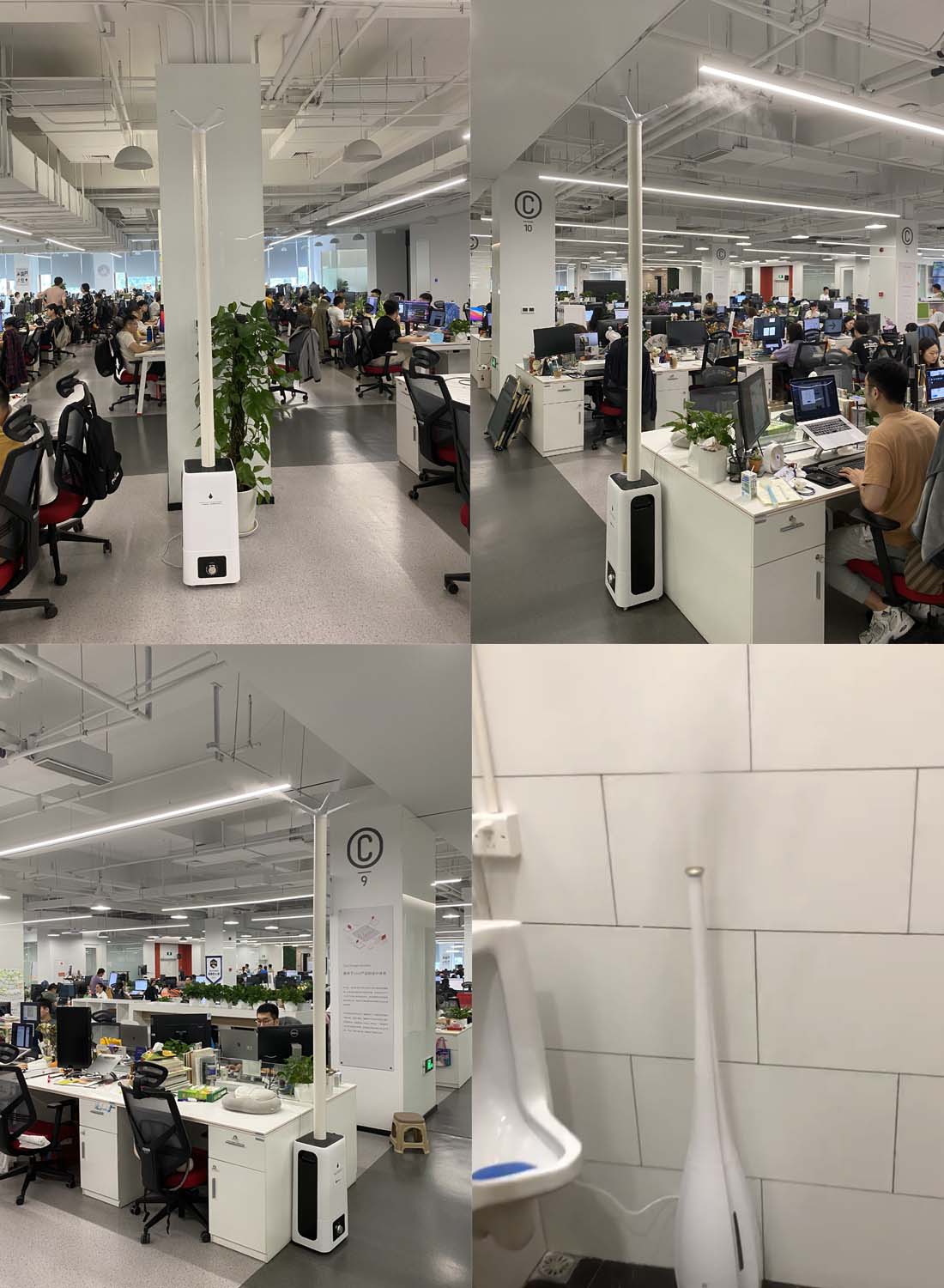 有贊科技由于扁平式架構(gòu),所有的員工都在同一個(gè)大型寫字樓里集中辦公,由于空間密閉并且人員非常集中,造成空氣質(zhì)量差,空氣中病菌也很多,所以在其辦公區(qū)域內(nèi)部署了大量的空氣霧化器+空氣凈化片,有效吸收空氣中的不良?xì)怏w并且起到了殺菌作用,從而大大的改善空氣質(zhì)量。同時(shí)在其衛(wèi)生間也布置了霧化器+空氣凈化片解決其臭味和細(xì)菌的問(wèn)題。